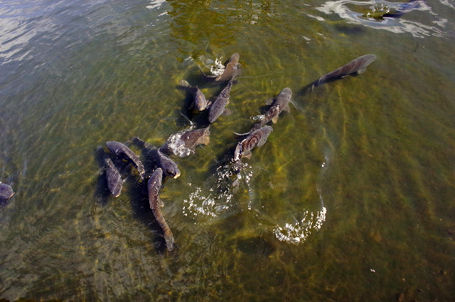 11時の方向に鯉のお刺身。1時の方向に鯉のから揚げ、5時の方向に鯉こく。